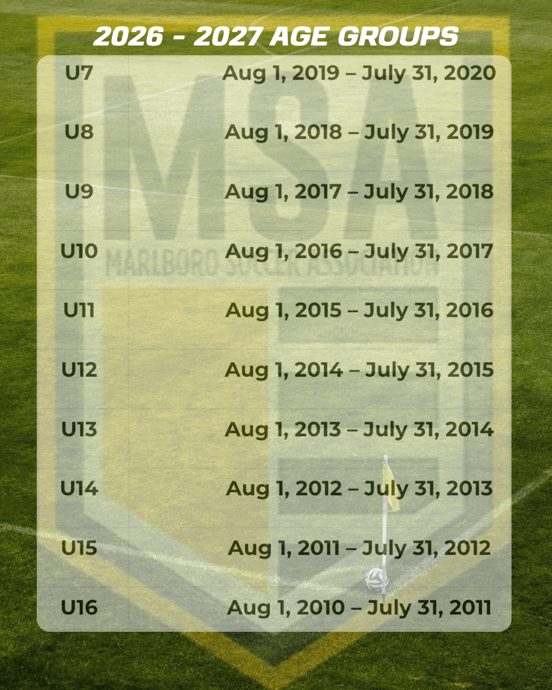 Starting in the 2026/27 competitive season, youth player age groups will be organized by the typical US school year (Aug 1- July 31) rather than by calendar year (Jan 1-Dec 31).